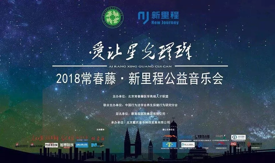 2018年1月9日,“爱让星光璀璨·2018常春藤·新里程公益音乐会”于北京天桥艺术中心隆重上演。晚会由北京常春藤医学高端人才联盟主办,中国行为法学会养生保健行为研究分会联合主办,新里程医院集团有限公司总冠名,北京戴氏音乐科技发展有限公司承办,旨在呼吁全社会共同关注、关爱孤独症群体。