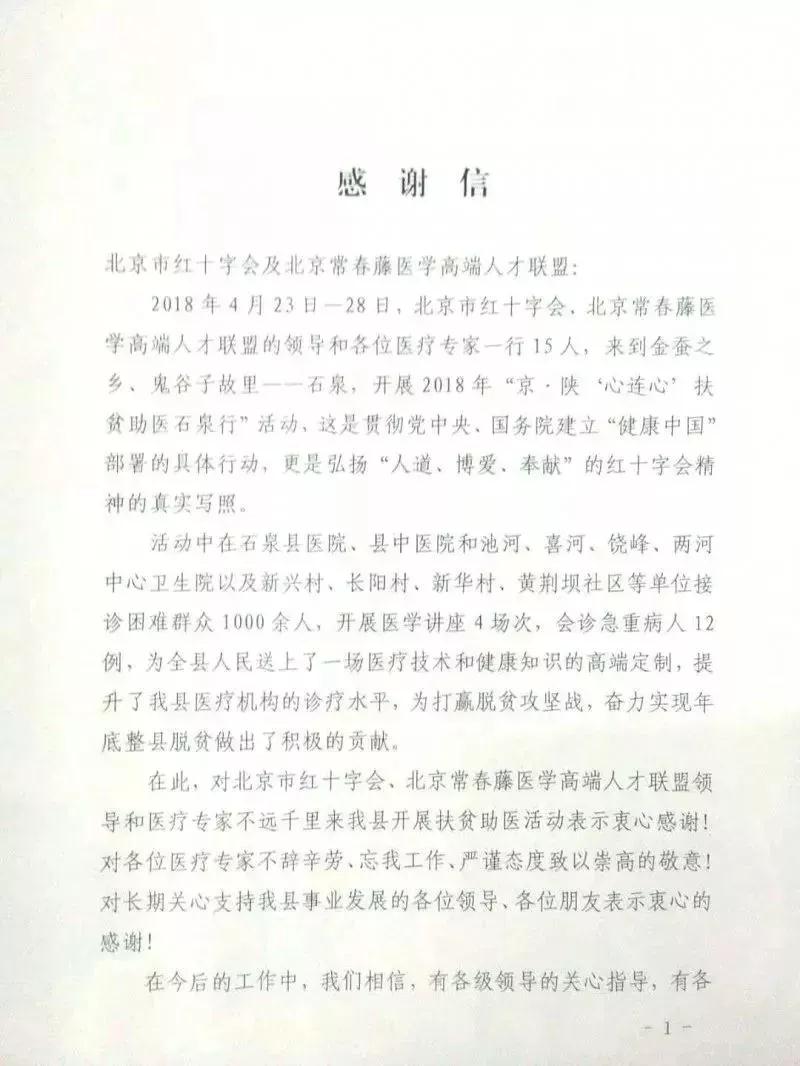 县医院党总支部书记马玉霞对此次“京·陕‘心连心’扶贫助医石泉行”的各位领导、常春藤联盟专家的付出表示感谢!本次活动,联盟专家们不仅到县级医院、镇卫生院,还不辞辛苦的入户探访贫困户,不仅让贫困户在家中就能享受到北京专家的诊疗,还在县医院开展贫困人口16种大病的集中救治工作。各位专家的敬业、奉献精神深深的感动了我们。