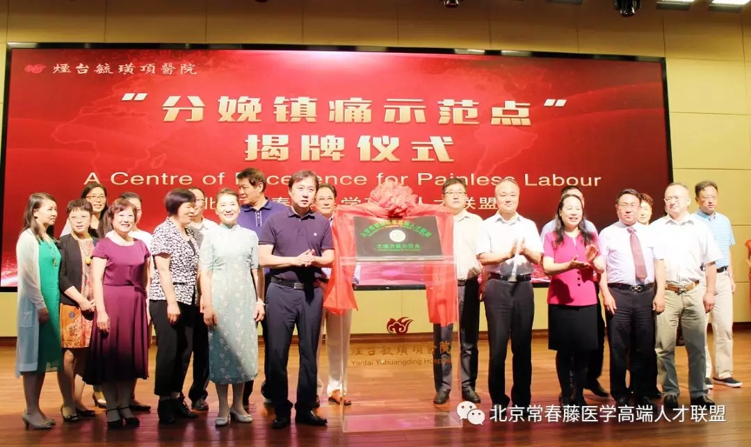 常春藤联盟秘书长王敬民, 烟台市卫生健康委员会副主任张葵阳,常春藤联盟副主席、北京大学第一医院妇产科副主任尹玲,常春藤联盟会员、北京大学第一医院麻醉科主任医师曲元,毓璜顶医院妇产科主任侯建青,毓璜顶医院西区麻醉科主任姜爱华等共同为“北京常春藤医学高端人才联盟无痛分娩示范点”揭牌。
