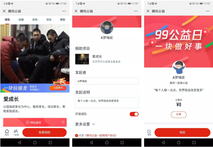 ①扫码后进入捐赠界面 ②发起活动 ③分享活动,邀请好友参与。