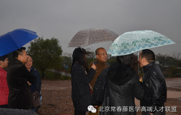 联盟副主席、北京金融街西环置业有限公司吴彬董事长在项目现场,冒雨向考察团成员介绍北京金融街西环置业有限公司在湖州南浔投资建设的“生态南浔 健康养老”项目