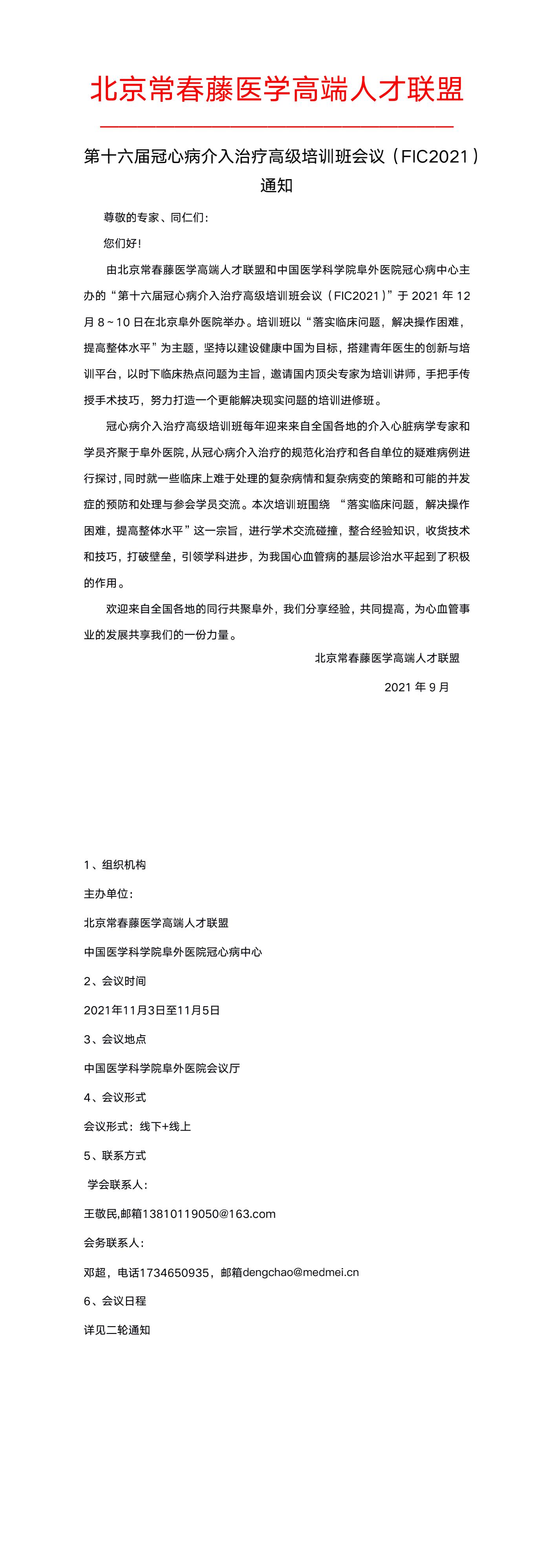 北京常春藤医学高端人才联盟关于举办“第十六届冠心病介入治疗高级培训班会议(FIC2021)的公示