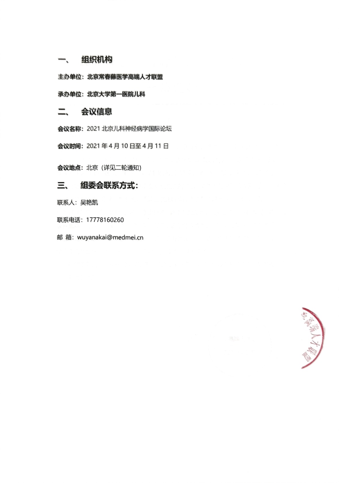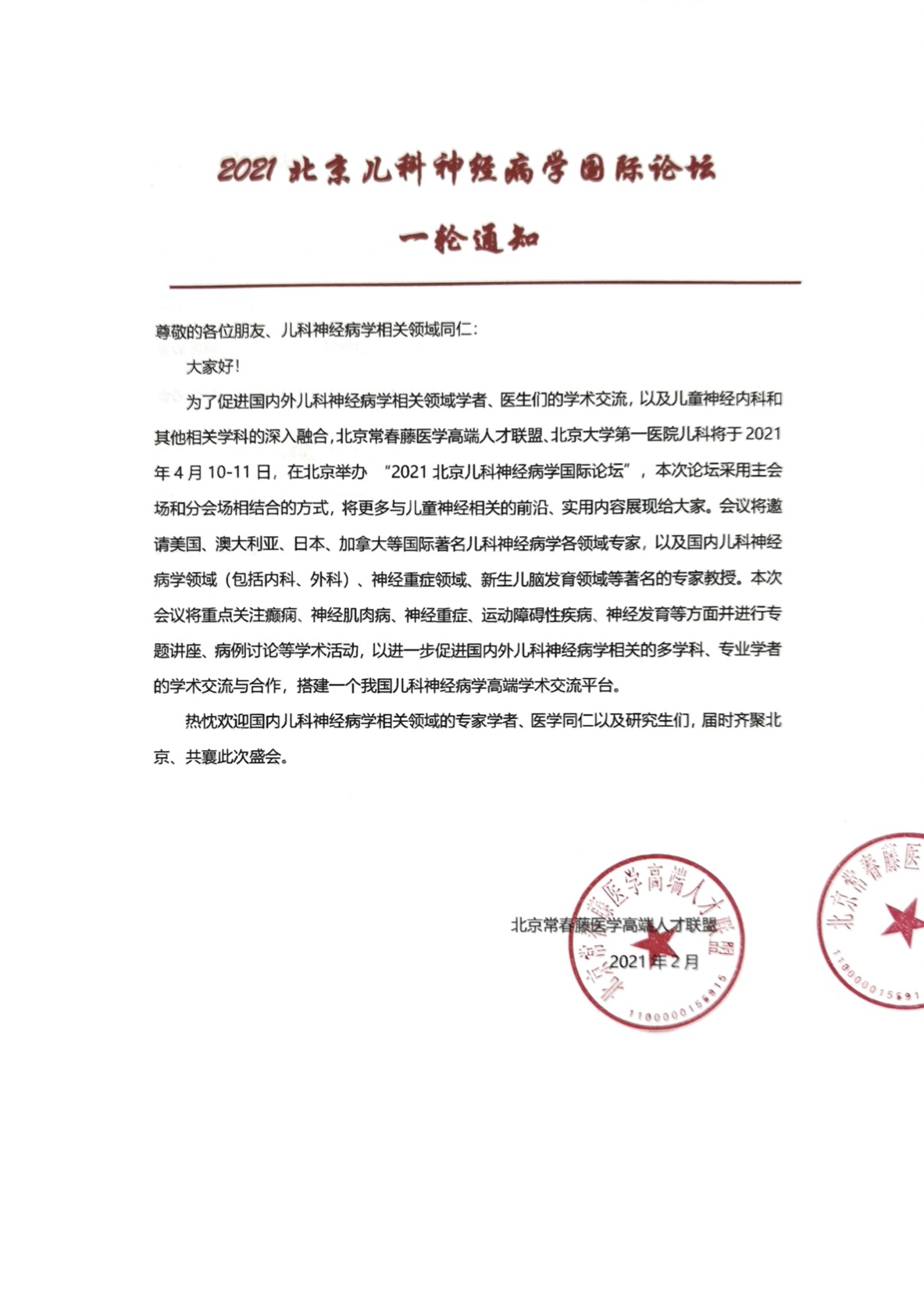 北京常春藤医学高端人才联盟、北京大学第一医院儿科将于2021年4月10-11日,在北京举办 “2021北京儿科神经病学国际论坛”,现就详细事宜公示如下: