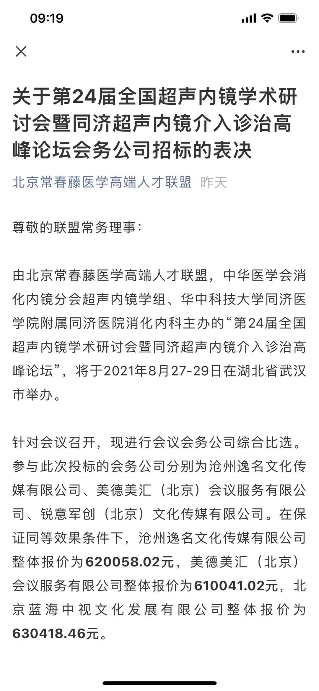 关于第24届全国超声内镜学术研讨会暨同济超声内镜介入诊治高峰论坛会务公司招标情况公示