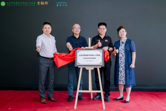 金融街泽康董事长吴彬先生,建信信托执行总经理邓峰先生,常春藤联盟执行主席、北京儿童医院王强教授、北京儿童医院张亚梅主任为“共建基地”揭牌