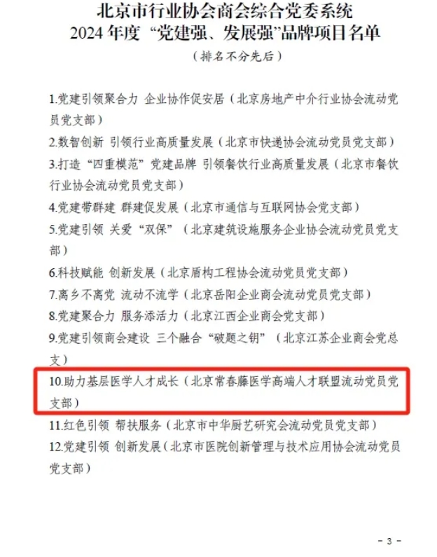 近日,由中共北京市行业协会商会综合委员会组织的2024年度“党建强、发展强”品牌项目评选结果出炉,北京常春藤医学高端人才联盟流动党支部“助力基层医学人才成长”成功入选。通知表示,这些党建品牌集中体现了社会组织党组织认真落实上级决策部署,在把牢方向、解决问题、完善治理、推动发展等方面的特色做法,具有鲜明的示范性、创新性和引领性。
