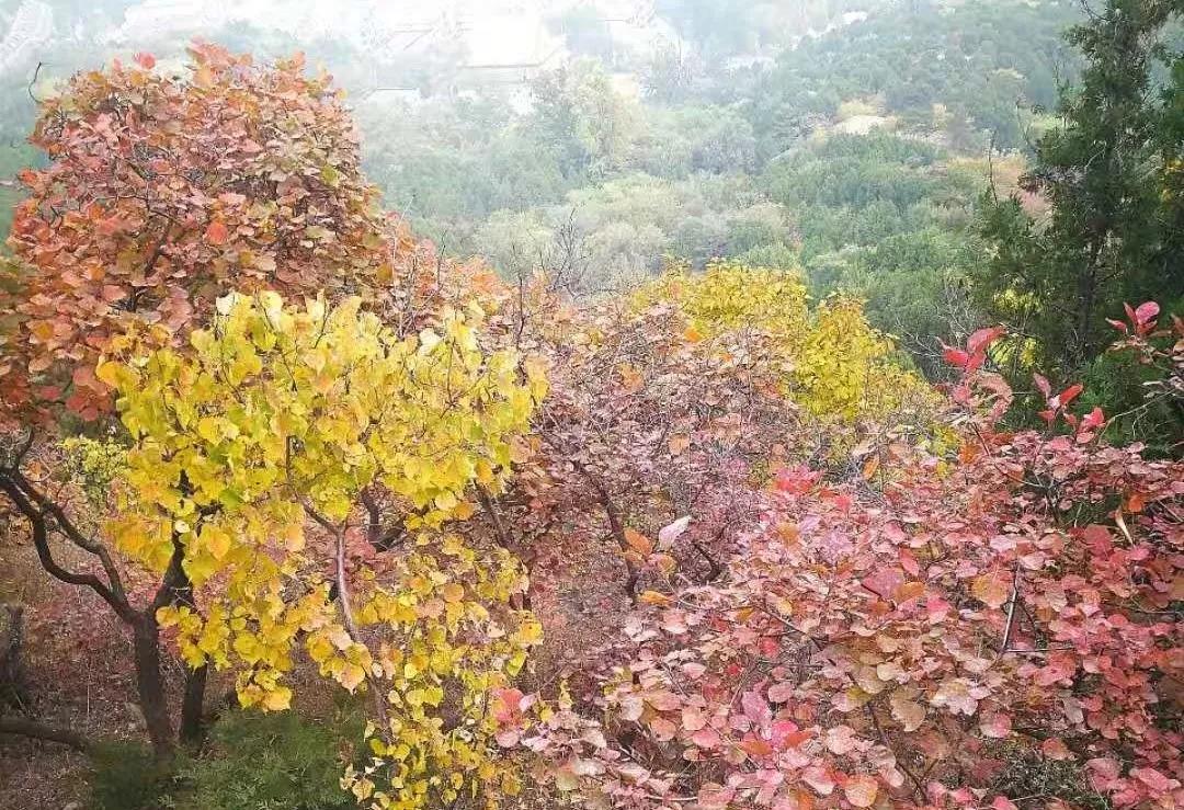 沿途一树一树的黄栌叶燃烧着灿烂的秋色,这些浓烈的色块穿插组合,无论从什么角度看,都是一幅绝美的画面。良辰美景,我自顾自地和老许尽情呼吸,拾级而上,放松身心。昂首走在缓坡上真想张开双臂放歌一曲,一吐我久居都市不知市外有桃园的压抑。而老许呢?仿佛被青春撞了一下腰,重回年轻时代,一会儿阔步一会儿缓行,左顾右盼,陶醉在了大自然中。