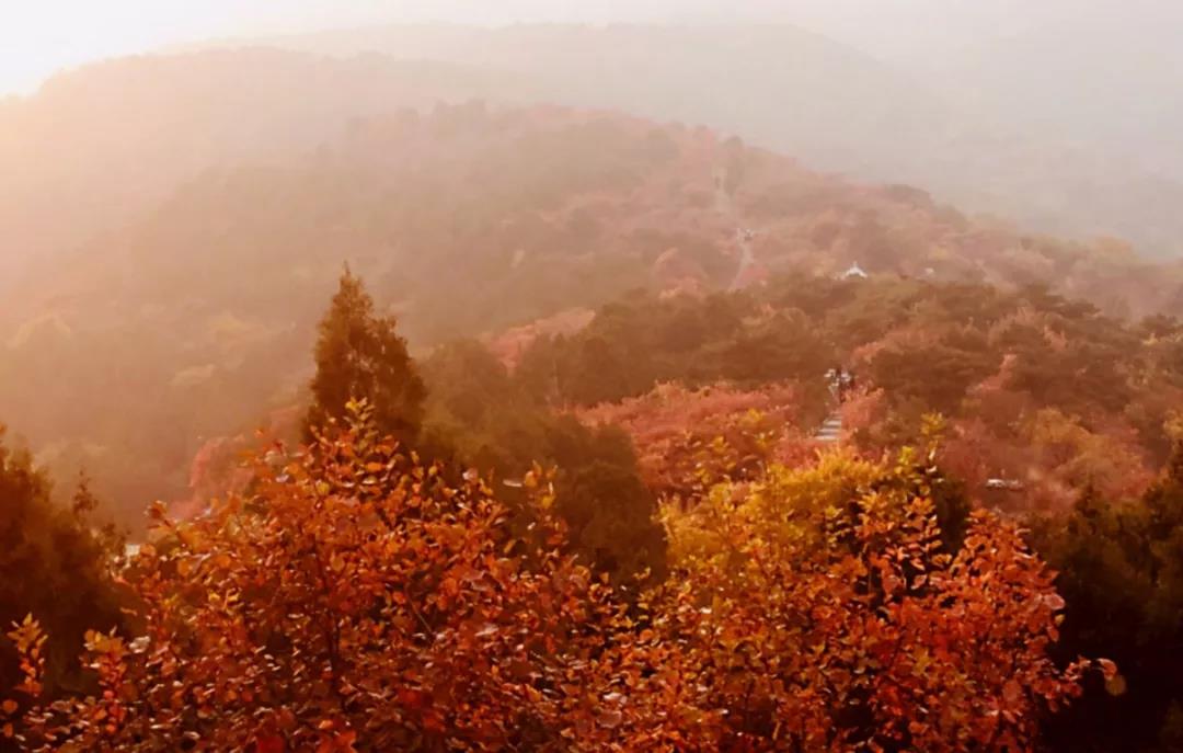 抓住这难得的放松机会,我和老许一鼓作气登到了山顶。登高望远,与平地景色不同的大全景观尽收眼底,高低疏密的大小黄栌层层叠叠,从黄色到红色错落有致,西山秋叶的磅礴之势淋漓尽现。